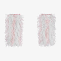 Lovely light beige cotton leg warmers for girls by Dutch brand Donsje. Ideal for adding an extra warm layer over the legs, they are made in a mid-weight cable knit design with stretchy ribbed trims and a white logo tab on the front.