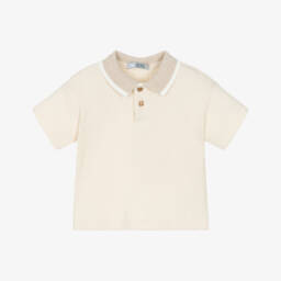Nautical-inspired ivory polo shirt for little boys by Dr. Kid. Knitted in soft cotton, this short-sleeved style has navy blue stripes and natural wooden buttons on the front.