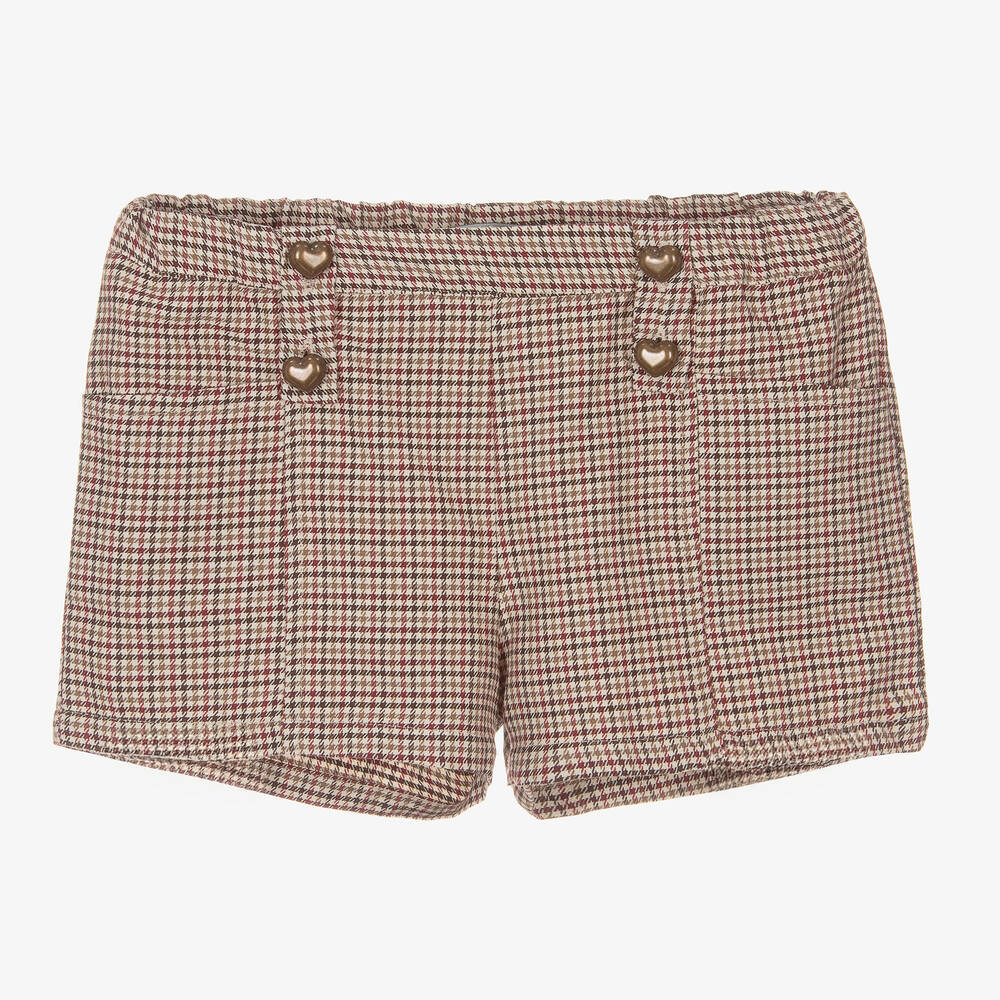 Lovely beige houndstooth shorts for girls by Dr. Kid, softly woven in cotton-blend twill. Accented with dark gold, heart-shaped buttons, these cute shorts have a part-elasticated waist for a super comfortable fit.