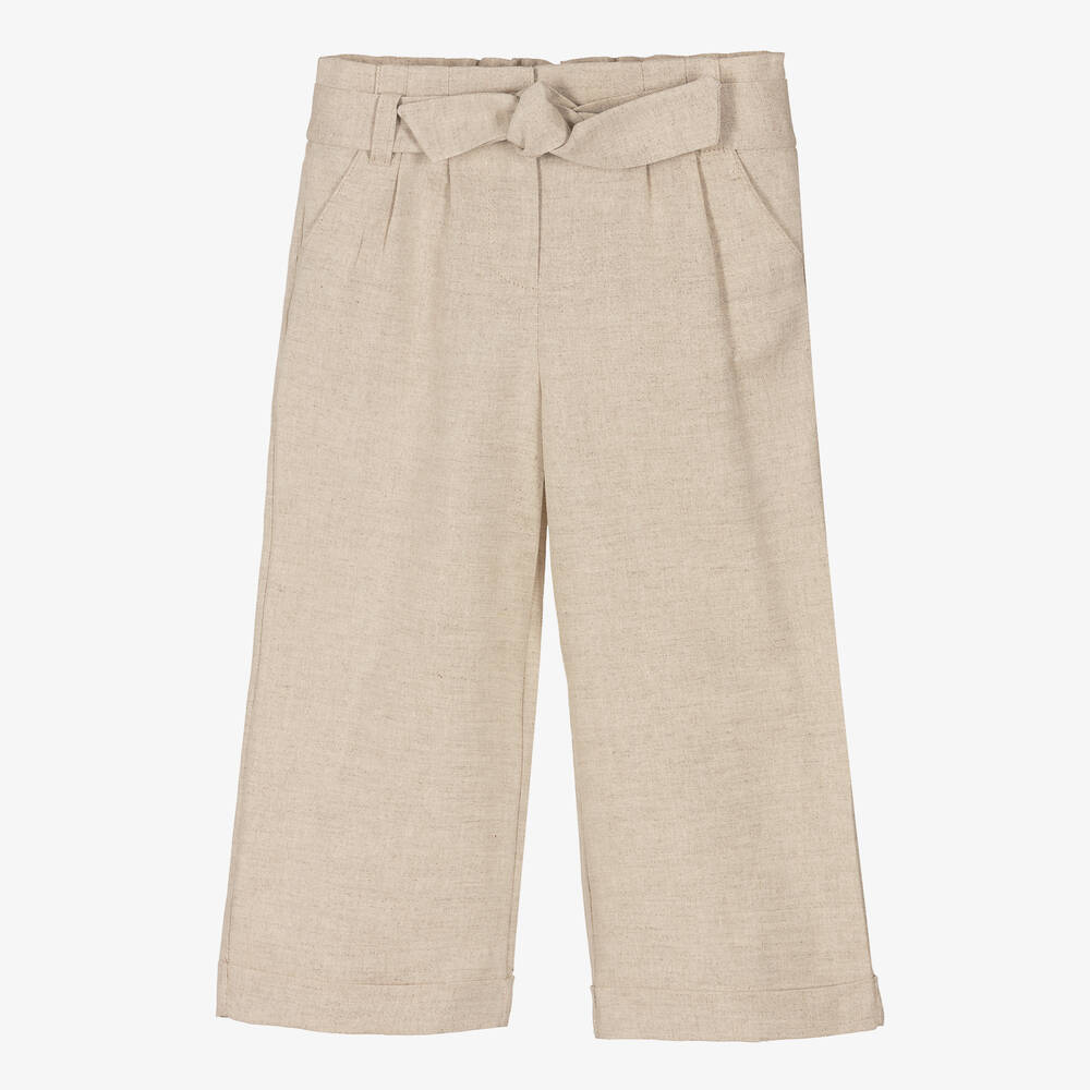Beige linen blend trousers for girls by Dr. Kid. They have a paper bag waist and a wide leg cut for a beautiful shape. For simple dressing, they fasten with a zip and button on the front and have a sash belt that can be bowed for a pretty finish.