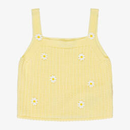 A lovely blue cotton top for girls by Dr. Kid, in a pretty lace knit pattern. This sleeveless top has frilly shoulder straps and pale pink flowers stitched on the front. Sits on the waist, it has pretty scalloped trims in a matching pink hue adding a playful finishing touch.