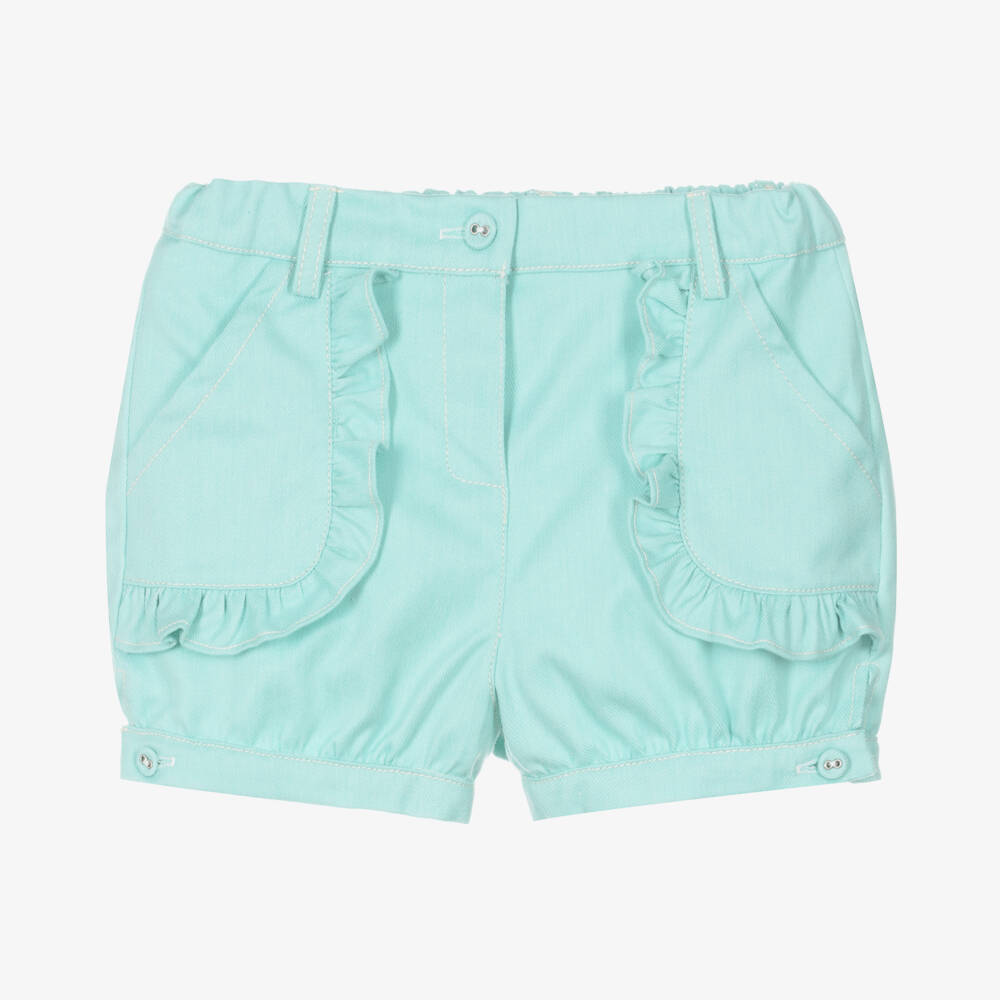 Cute turquoise green shorts for little girls by Dr.Kid, made in a comfortable cotton blend with frills on the patch pockets. In soft, lightweight twill with ivory overstitching, they fasten with a button and have a useful, adjustable waistband for a great fit. The gathered cuffs have button fastenings on the sides.