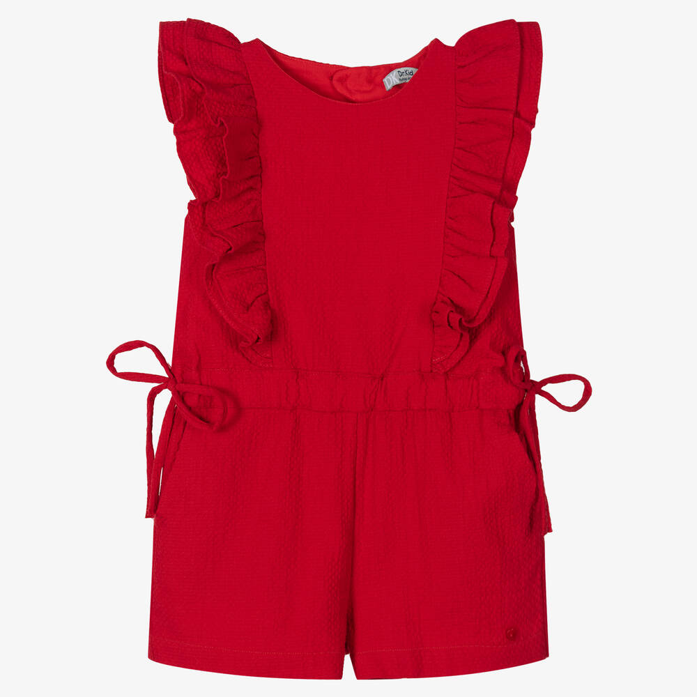 Cute red playsuit for girls from Dr. Kid, made in textured cotton jersey. It has a feminine shape created from frill detailing on the top to an elasticated waist. Two decorative drawstrings are bowed on the sides for a sweet finish. The back has a cut-out section that fastens with two heart-shaped buttons.