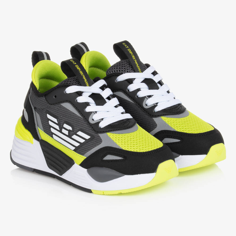 Black, grey and neon yellow lace-up trainers for teen boys by EA7 Emporio Armani. These sporty shoes have an eye-catching, rubberised Eagle logo on the side, with further logos on the heels and tongues. Featuring black faux leather and light reflective trims, these mesh sneakers have a soft textile lining and a chunky rubber outsole for comfort and grip.