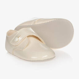 Ivory traditional pre-walker shoes for little boys by Early Days Baypods, made in soft patent faux leather. They have a flexible sole and a comfortable lightly padded insole, with a single button fastening.