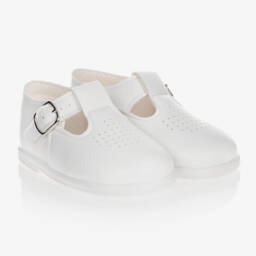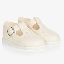 Ivory first walker shoes for little boys and girls from British brand Early Days, in a traditional T-bar style. Made in soft faux leather with a charming punched hole pattern on the toes, they have a textile lining and a lightly cushioned insole for comfort. These classic shoes fasten with an adjustable silver buckle and have flexible non-slip rubber soles.