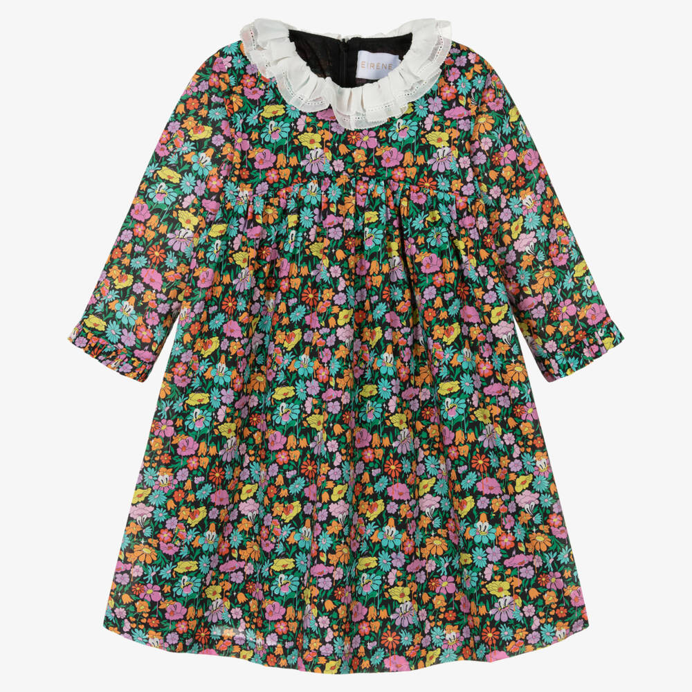Beautiful multicoloured dress for girls by Eirene, made in super soft Tana Lawn™ cotton. The A-line cut creates a feminine silhouette and the voile ruffle collar adds a sweet finish to the eye-catching Liberty print of animated flowers. It fastens with a concealed zip on the back for easy dressing and a seamless finish.