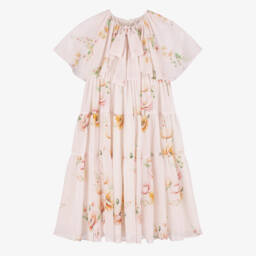 Elegant, pastel pink dress for girls by EIRENE, made in soft lace and woven with a shiny thread for subtle sparkle. A chic, A-line design, it has puffed sleeves with an open seam and a beautiful crêpe chiffon bow at the neck. The dress has a satin underlayer, a comfortable, lightweight cotton lining and it fastens neatly with a concealed zip on the back.