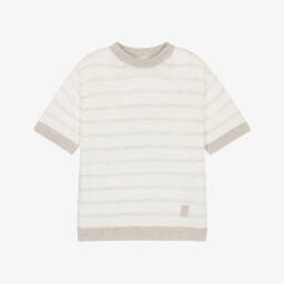 Grey marl T-shirt for boys by Italian label Eleventy Milano, made in comfortable cotton jersey. The soft grey fabric is complemented by a striking navy blue trim on the knitted white neckline. An embroidered logo above the hem adds a subtle designer touch, offering a stylish option for casual days.