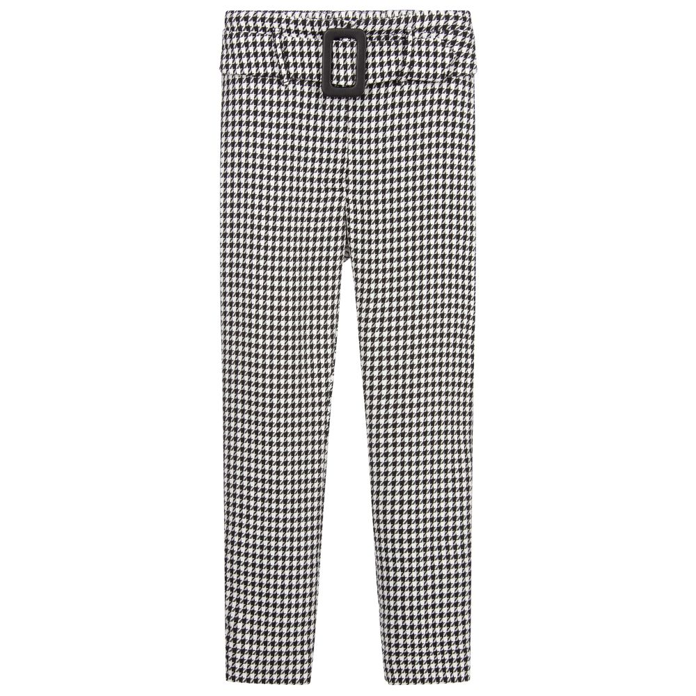 Girls stylish black and white houndstooth check trousers by Elsy. Made in soft and stretchy jersey, they have an attached buckle fastening belt and are slim fitting.