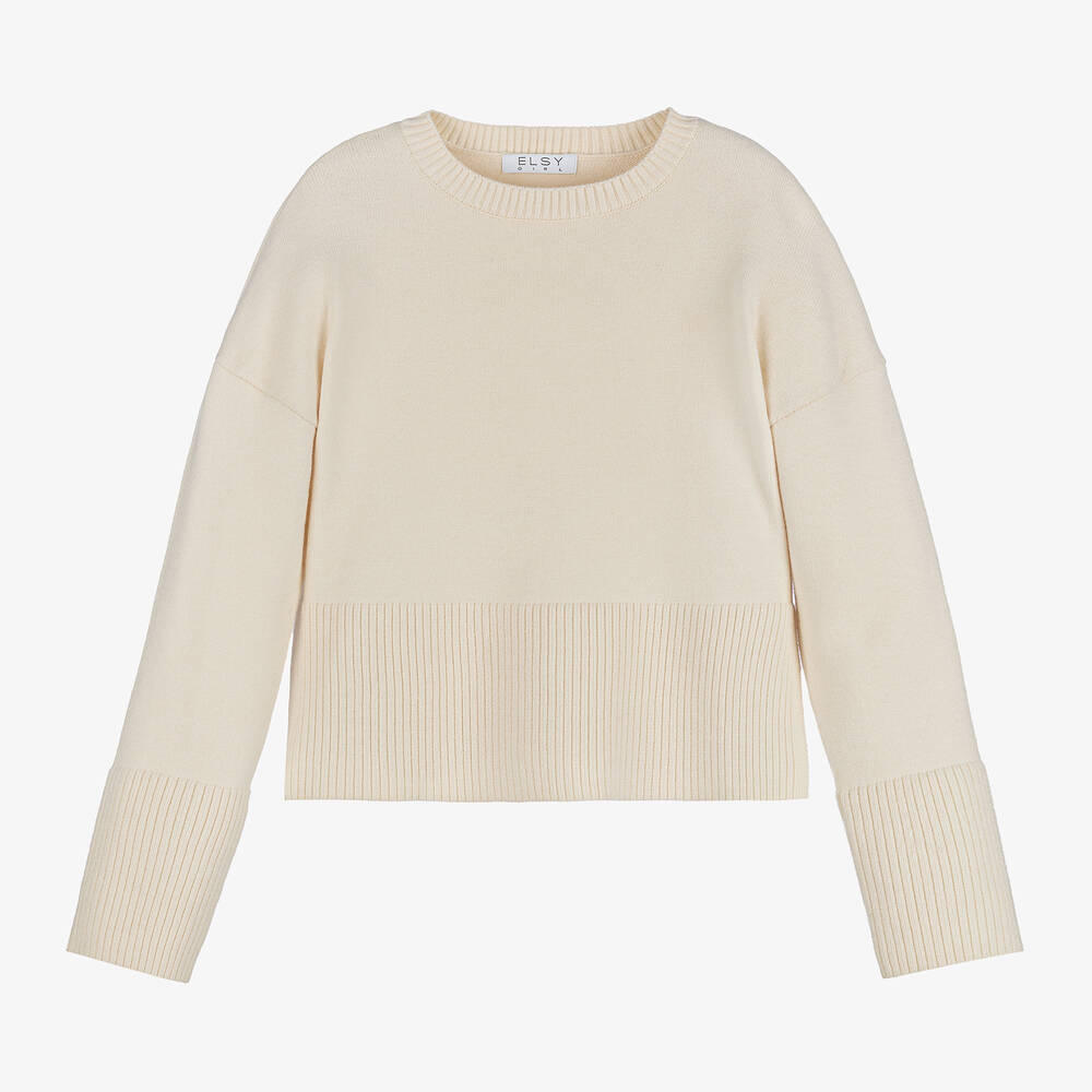 An elegant long-sleeved ivory sweater for girls by Italian brand Elsy. It is knitted in a beautifully soft viscose blend, with stylish dropped shoulders. The deep cuffs and hem are ribbed, and there are vented sides for ease of movement.