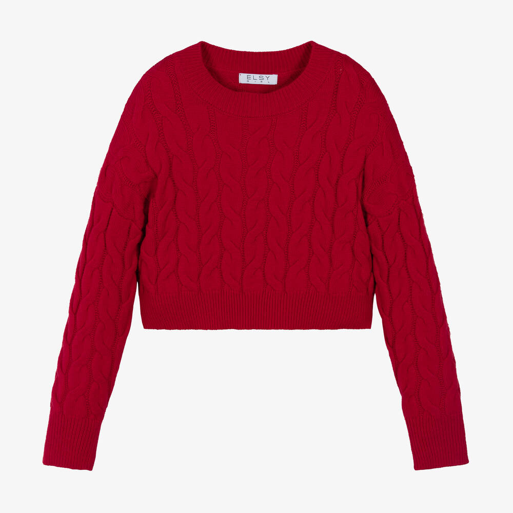 A red sweater for girls by Italian label Elsy, knitted in a super-soft viscose blend. Effortlessly chic, this jumper finishes nicely at the waist and has a classic cable knit pattern with ribbed trims.