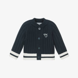 Boys four-piece baby bottle set by Emporio Armani. Included in the set are two different sized bottles with navy blue logo branding and matching caps. The bottles are shatterproof and easy grip, with silicone teats. Also included is a white and navy blue pacifier and dummy clip.