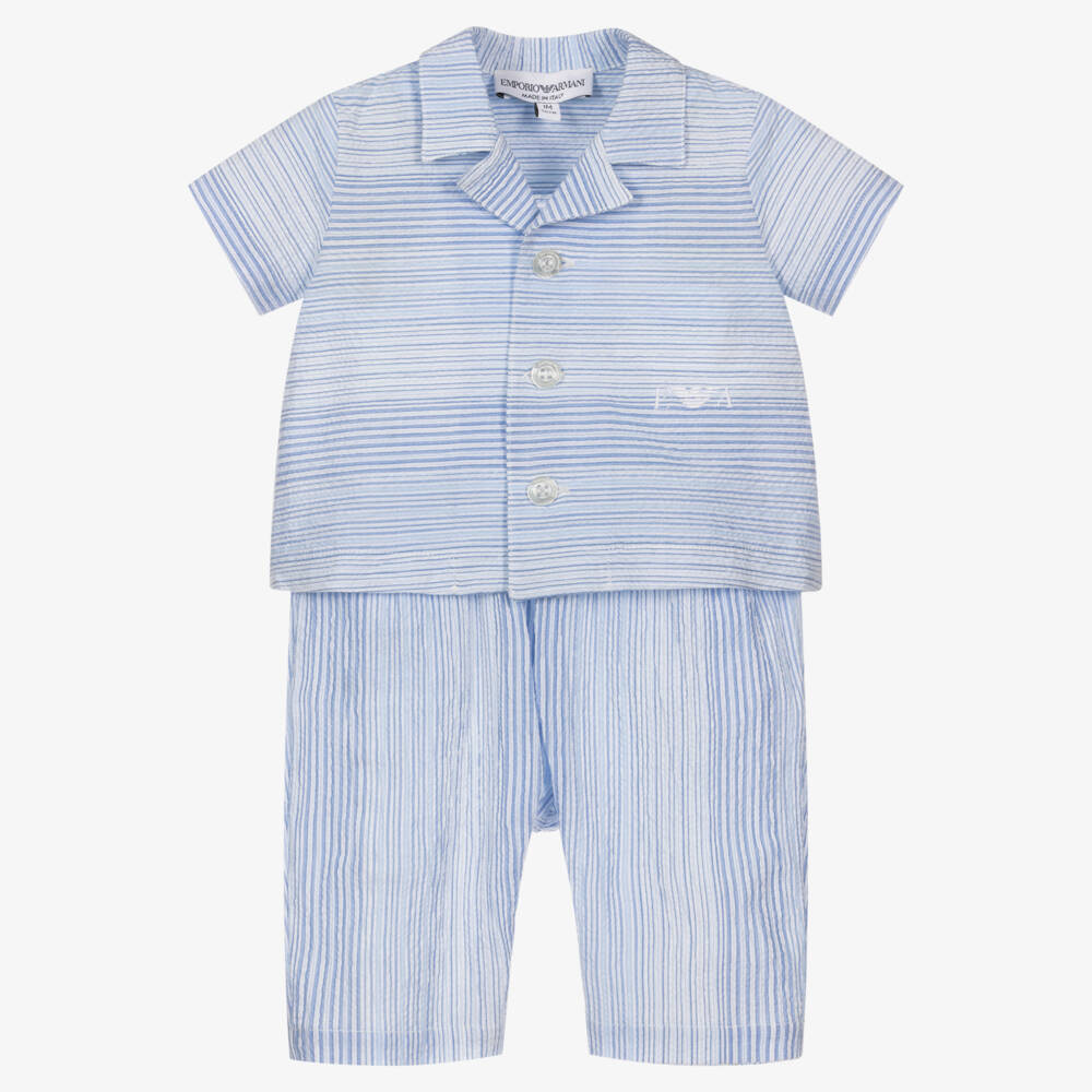 Lovely blue cotton trouser set for baby boys by Italian designer Emporio Armani, made in lightweight seersucker. The shirt has a casual, revere collar, an embroidered white logo on one side and logo button fastenings. The coordinating trousers have an elasticated waist for a good fit and a cute patch pocket around the back.