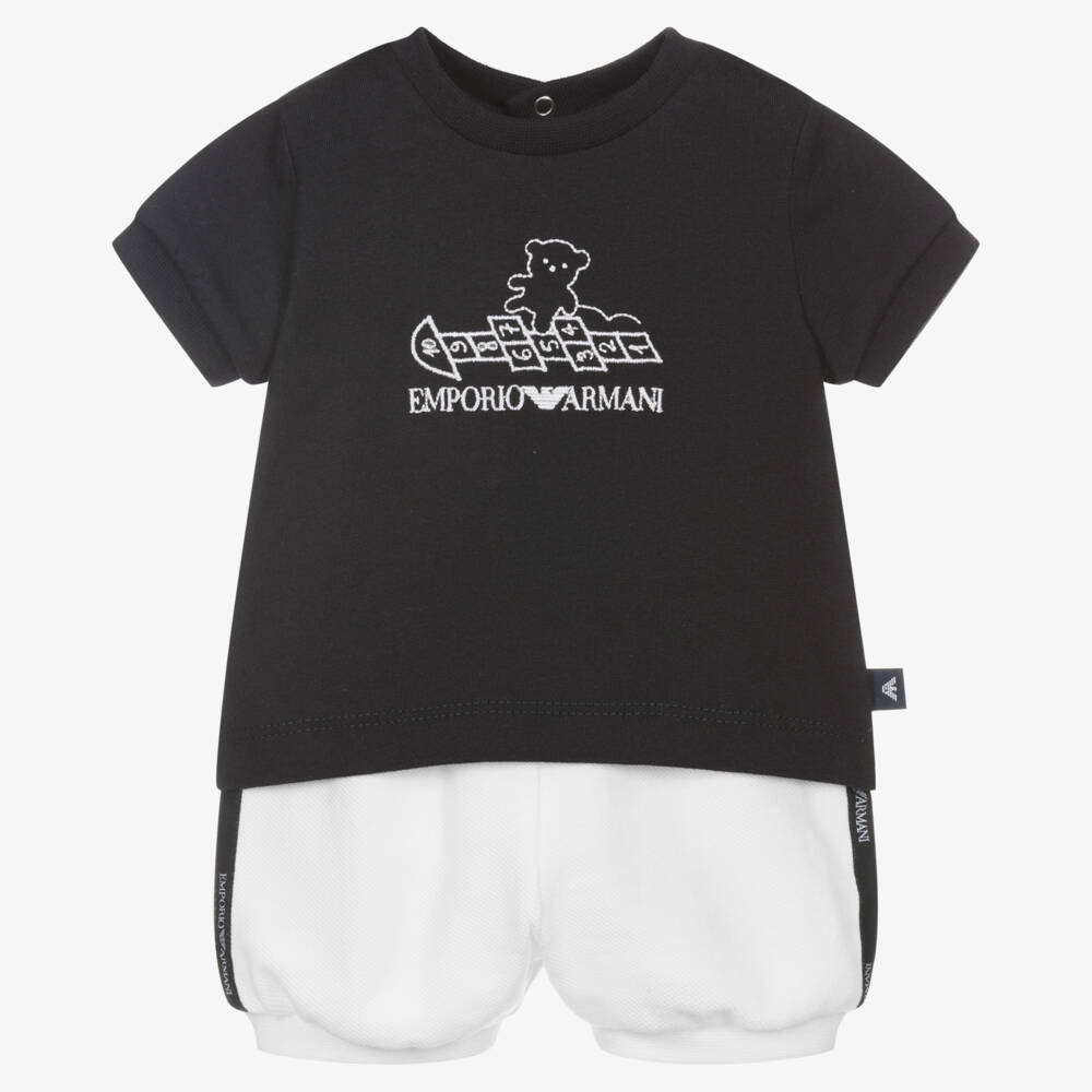 Cute and comfortable, this cotton shorts set for baby boys is by Italian designer Emporio Armani. The navy blue T-shirt has a teddy bear playing hopscotch and a logo embroidered on the front in white. It is made in stretchy jersey and has easy-to-use logo popper fastenings on the back. The stretchy white piqué shorts have navy blue logo taping on the sides and an elasticated waist for a good fit. The set comes in an organza bag. It is made from organic fibres.