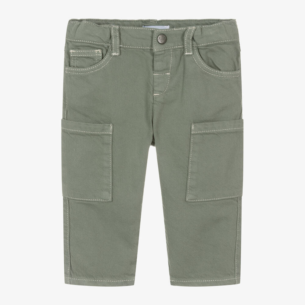 Casual sage green trousers for baby boys by Emporio Armani, made from soft, mid-weight cotton twill. Designed with a relaxed fit, they have a five-pocket jeans styling with an additional cargo-style pocket on each leg. The brand's iconic Eagle logo in antiqued silver finish can be seen on the back and embossed on the popper fastening. The adjustable waistband is useful for a good fit.