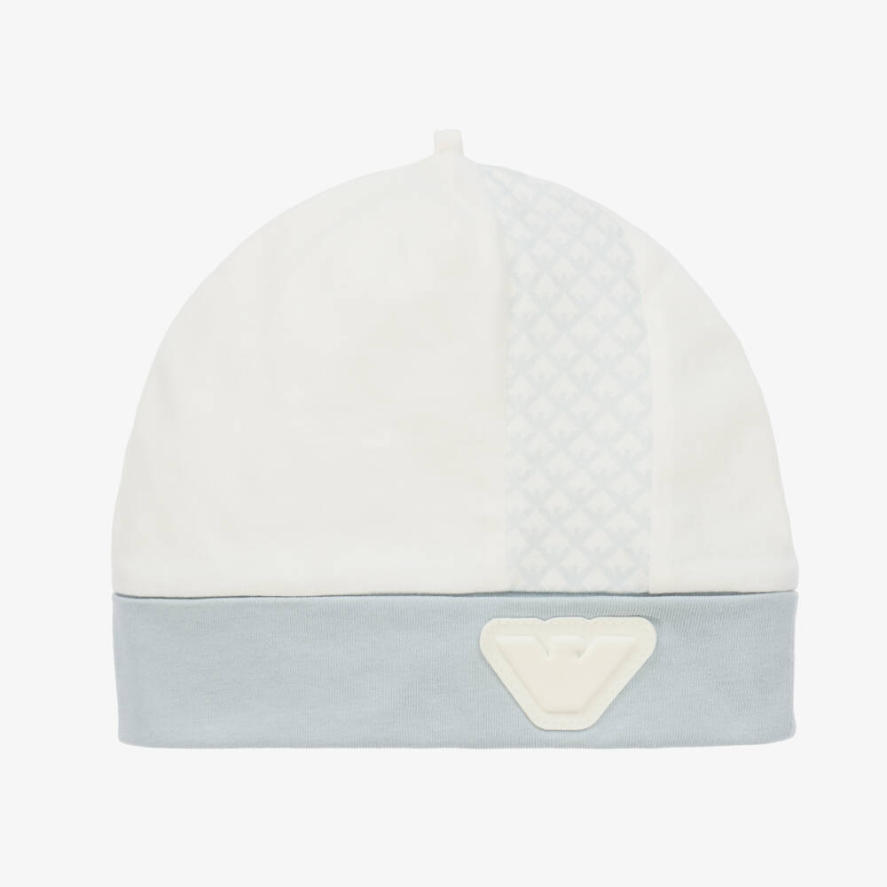 An ivory and light blue hat for baby boys from Italian brand Emporio Armani. Made in a double layer of super-soft cotton jersey, the front is decorated with Eagle logo prints and a branded appliqué detail. It comes with a lovely branded storage bag.