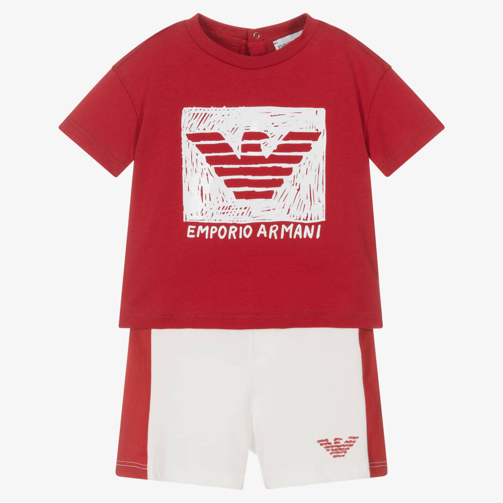 Casual red and white cotton shorts set for baby boys by Italian designer Emporio Armani, made in comfortable jersey. The red T-shirt has a white logo print on the front designed to look roughly sketched, for a stylish streetwear-inspired look. It has easy-to-use popper fastenings around the back. The white shorts have sporty red side stripes, a sketchy white Eagle logo on one leg and a stretchy elasticated waistband. The set is made partially from recycled and organic fibres.