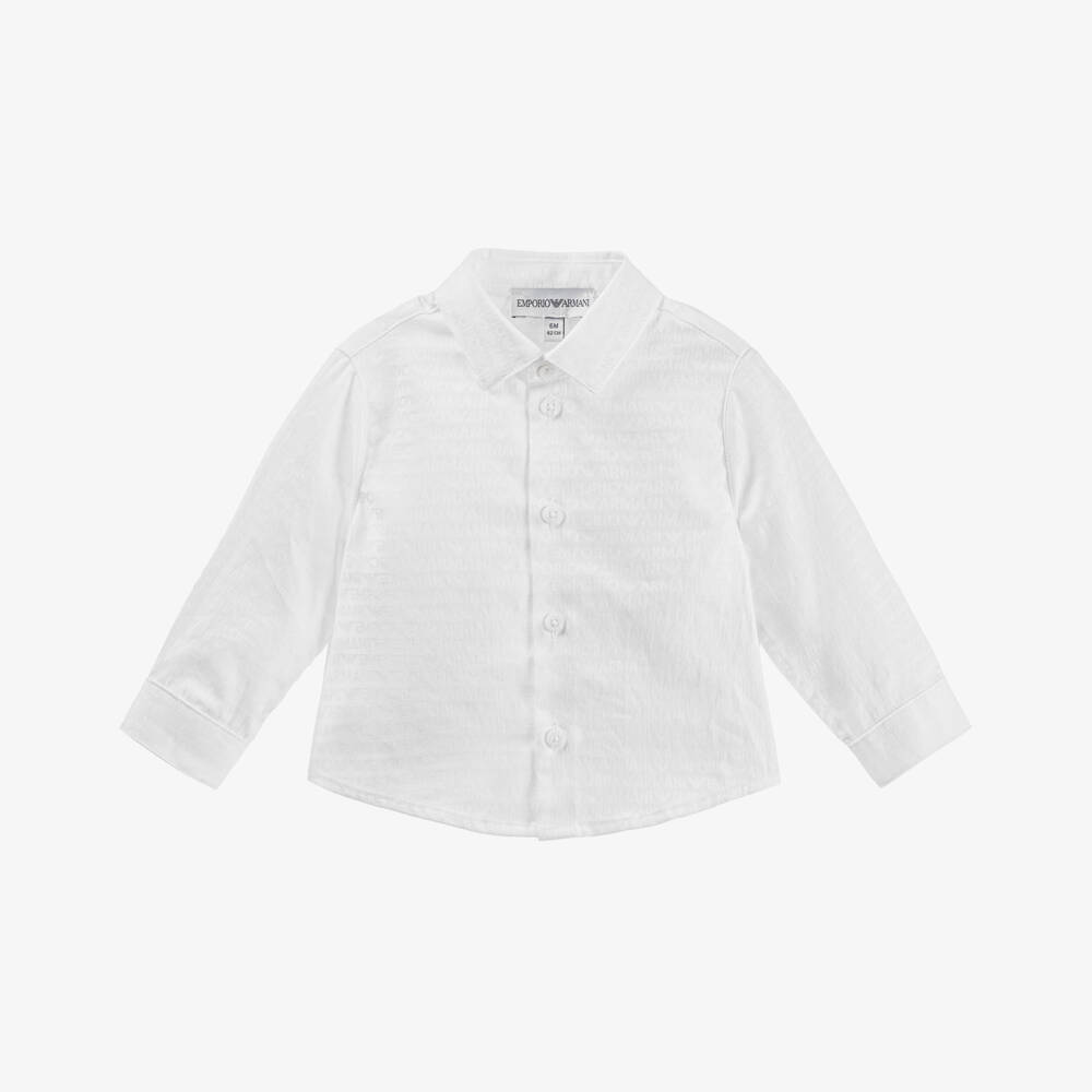 An off-white shirt for baby boys from Italian label Emporio Armani, made in soft and lightweight cotton poplin. This classic style has long sleeves and a smart collar, with a subtle logo pattern printed all over for designer appeal. It fastens on the front and cuffs with branded buttons for a neat finish.