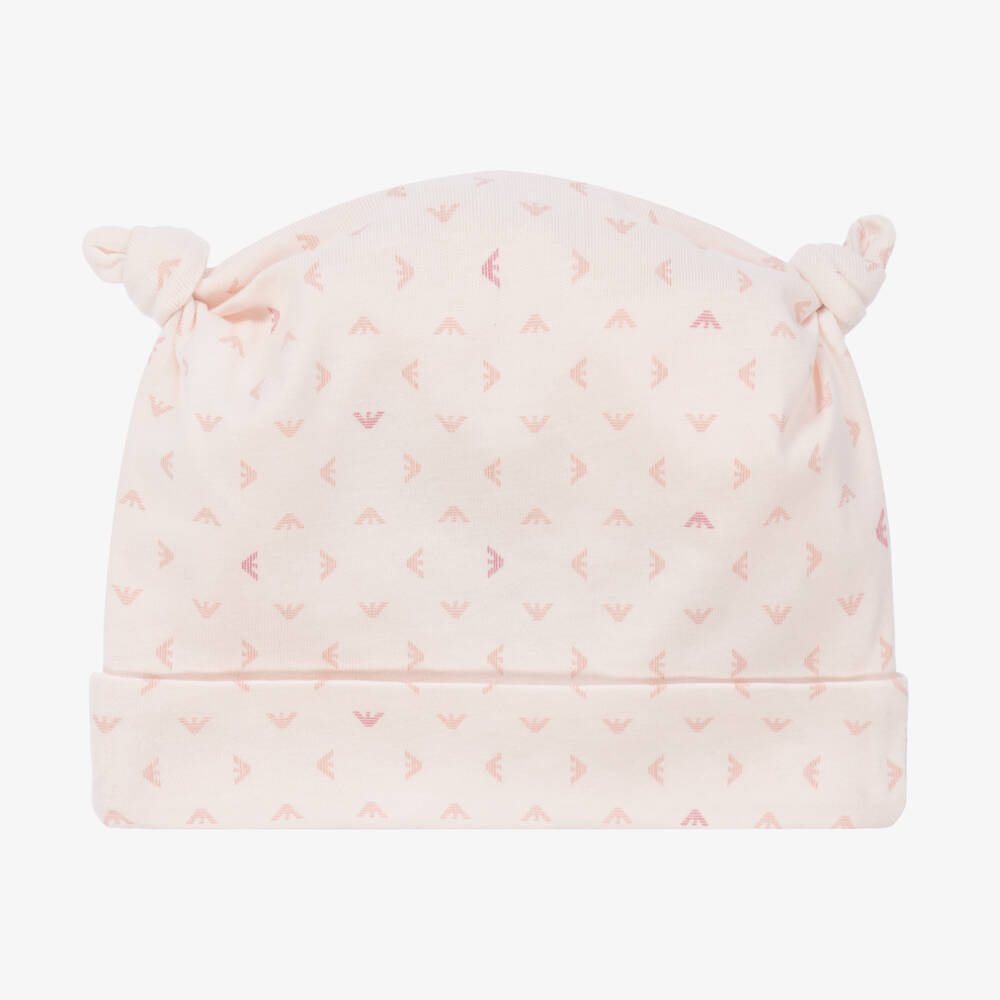 Pink beanie hat for baby girls by luxury Italian brand Emporio Armani, patterned with the distinctive Eagle monogram logo in light and dark pink. Made in soft and comfortable cotton jersey, this hat has adorable knotted details and a folded hem.
