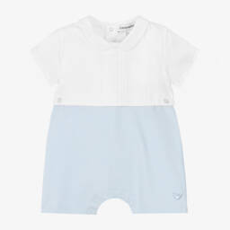 Lovely white and pastel pink cotton shortie by Emporio Armani, combining style and comfort for baby girls. Woven with a fine pattern, the top has a Peter Pan collar, pintuck detailing and decorative branded buttons. The soft jersey lower part features the brand's signature Eagle logo embroidery for a subtle designer finish.