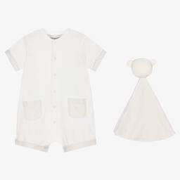 Baby boys navy blue and white shortie and doudou gift set by luxury Italian brand Emporio Armani. The white trims are patterned with tiny blue Eagle logo, matching the adorable teddy doudou. Both are made in soft and comfortable cotton jersey with logo popper fastenings on the shortie to help with dressing. The set comes in a lovely organza bag, perfect for gifting.