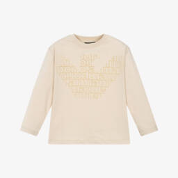 Beige cotton top for boys by Emporio Armani, made in soft comfortable jersey. This casual top features a flocked, tonal beige Eagle logo on the front, made in repeated logos.