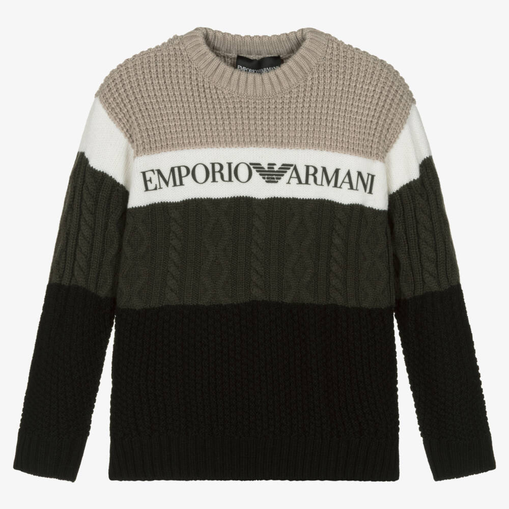 A cosy sweater for boys from Italian brand Emporio Armani, with beige, khaki green and black panels. Knitted in various patterns for an interesting texture, it is made in a luxuriously soft wool mix, with an Emporio Armani rubberised logo across the front.