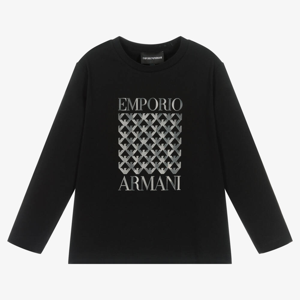 Black long-sleeved top for boys from Italian brand Emporio Armani, with an eye-catching reflective Eagle logo design. Made in soft cotton jersey, it has a ribbed crew neck for stylish yet casual wear.