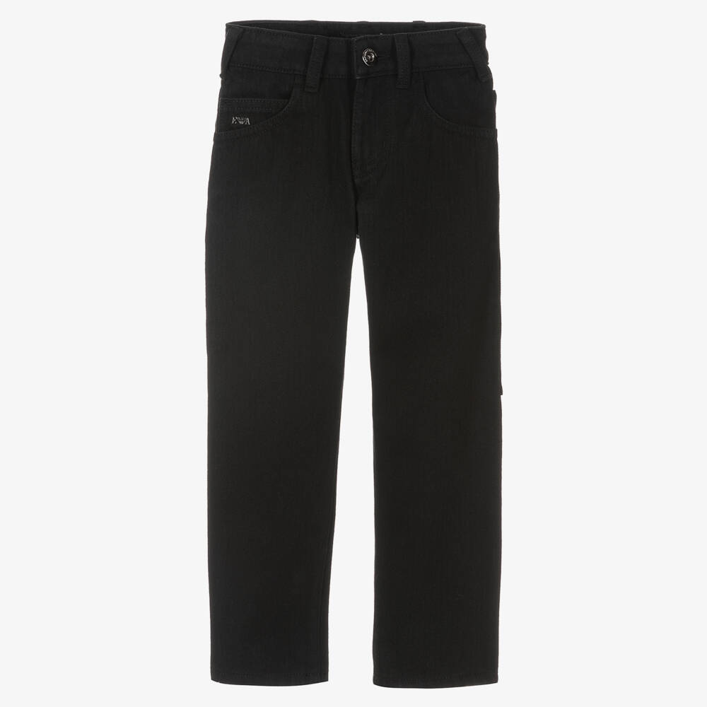 Black jeans for boys by Emporio Armani, made in soft denim. With classic five pocket styling, they have black and white logo tape trims on the side of each leg. There is a metal Emporio Armani logo on the coin pocket and a metal Eagle logo on the back pocket. They fasten with a button and zip and have a useful adjustable waist.