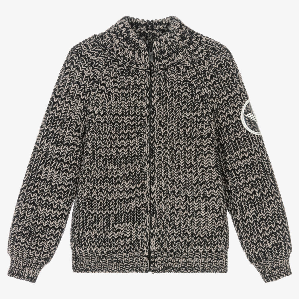 Black and grey marl zip-up top for boys by Emporio Armani, in a soft chunky knit. For instant brand recognition, it has a transparent badge on one sleeve, with a white rubberised Eagle logo. Made in a luxuriously soft wool blend, it is sure to keep him warm and cosy.