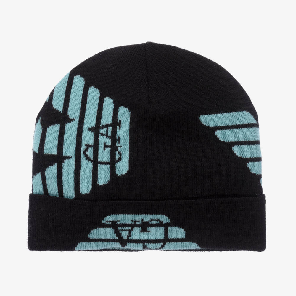 A black and turquoise blue beanie hat for boys from Italian label Emporio Armani. It is knitted in a double layer of super-soft virgin wool for luxurious comfort and warmth. Jacquard Eagle branding decorates the fabric for instant designer appeal.