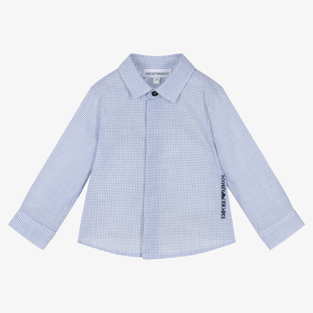 In a fine blue and white check, this smart shirt for little boys is by Emporio Armani. It has a navy blue embroidered logo down one side for a signature look. There is a concealed front button placket, with branded button fastenings on the sleeve cuffs.