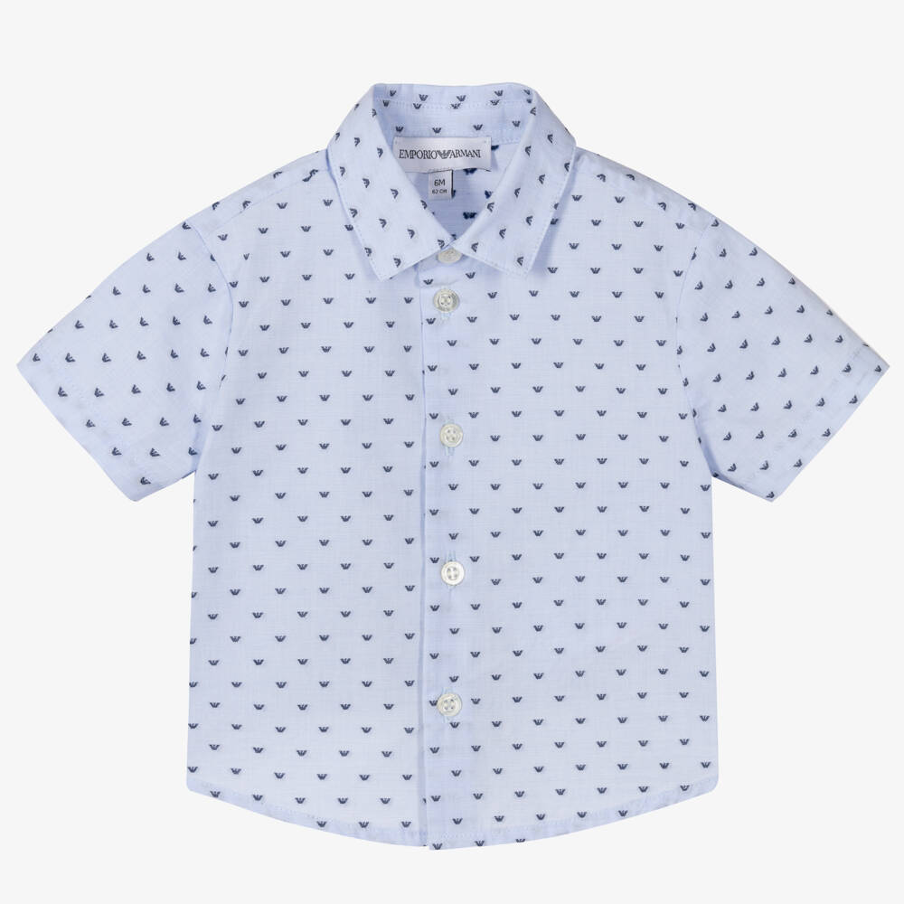 Little boys pale blue short sleeve shirt by Emporio Armani, made in soft cotton poplin. Unmistakably Armani, the designer's Eagle logo can be found all-over as a navy blue repeat pattern. It fastens easily with branded buttons.