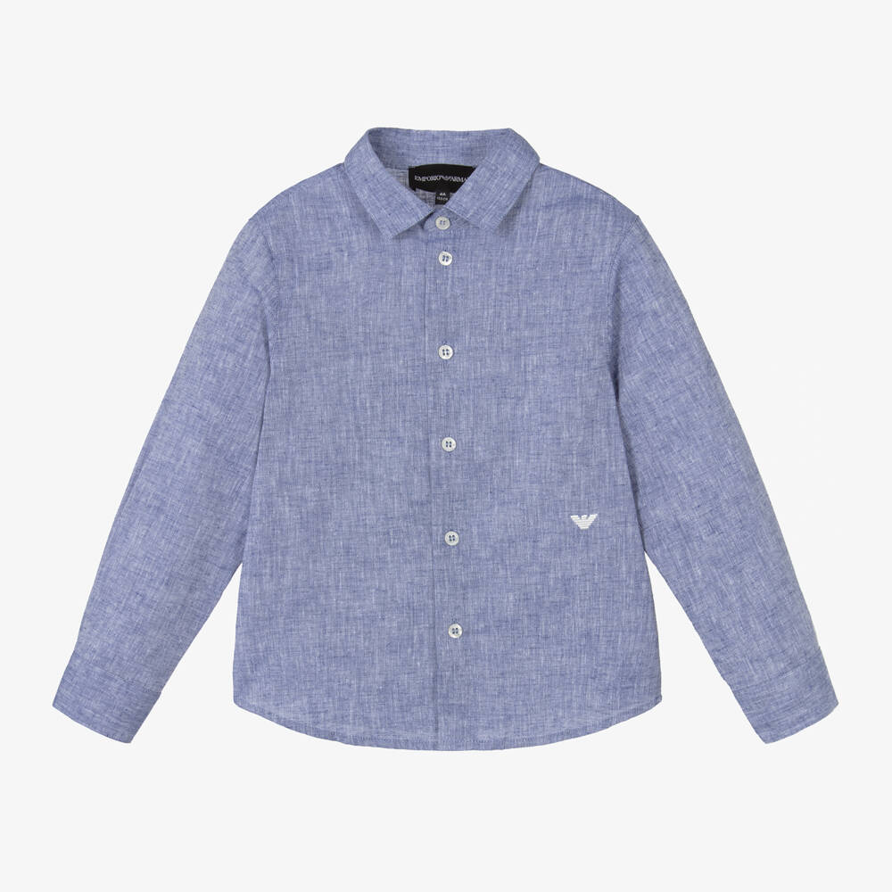 Smart-casual shirt for boys by Italian brand Emporio Armani, in a lovely mid-blue natural linen look. Soft and lightweight, it is woven in a cotton and linen blend with a white Eagle logo embroidery for an iconic finish. Simple and timeless, it has a pointed collar, long sleeves and subtly branded button fastenings on the front and cuffs.