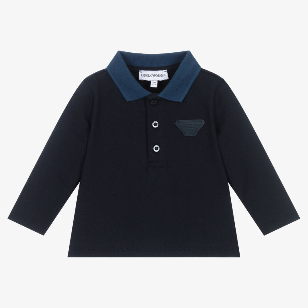 Dark blue polo shirt for little boys by Emporio Armani, made in soft cotton piqué. It has a rubberised Eagle logo on the chest for a signature look. There is a ribbed collar in contrasting blue, with branded button fastenings on the front.