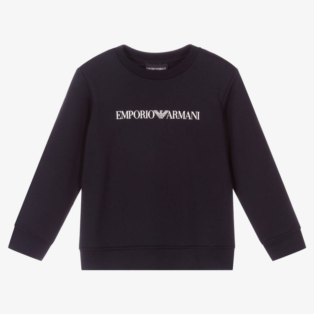 Navy blue sweatshirt for boys by luxury brand Emporio Armani, made in super soft modal cotton jersey. It has a white rubberised logo across the front.