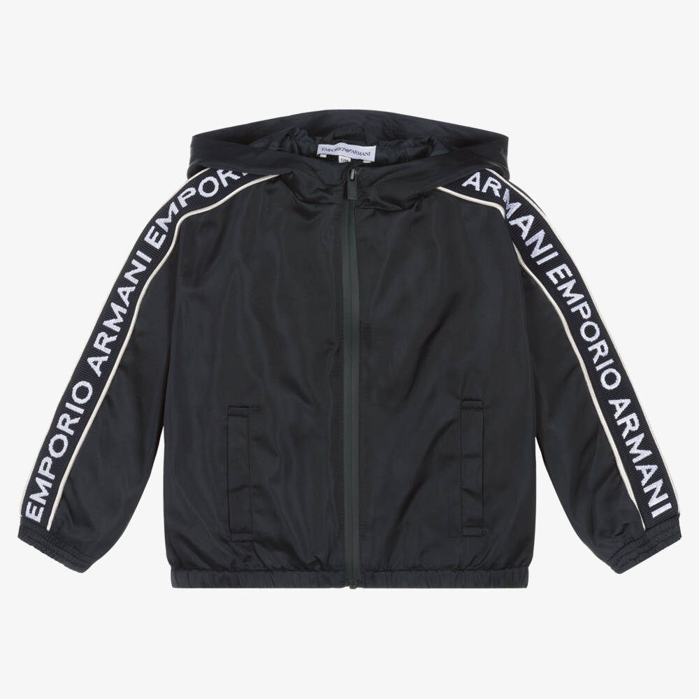 Navy blue windbreaker jacket for little boys by luxury Italian designer Emporio Armani, made from smooth and sustainable recycled materials. Cool and contemporary, the sleeves have the brand's signature navy blue and white taping. This hooded, water repellent jacket has taped zip fastening and elasticated trims to protect your child from the elements.