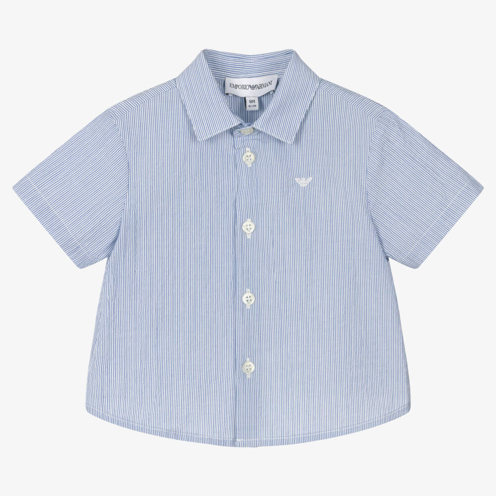 Laid-back blue and white striped shirt for little boys by Emporio Armani, made in lightweight Oxford cotton. Fastening with buttons, this smart casual shirt has white Eagle logo embroidery on the front.