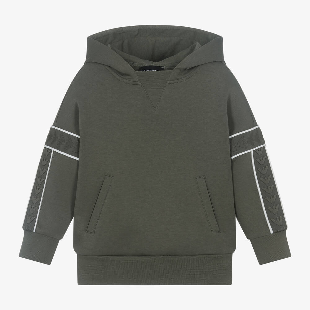 A khaki green hoodie for boys by Italian brand Emporio Armani, made in a wonderfully soft and stretchy cotton blend jersey. Ideal for adding a designer touch to their casual wardrobe, this comfortable top has dropped long sleeves detailed with the brand's iconic Eagle logo. To complete the relaxed look, it is styled with useful pockets on the front, a jersey-lined hood and stretchy ribbed cuffs and hem.
