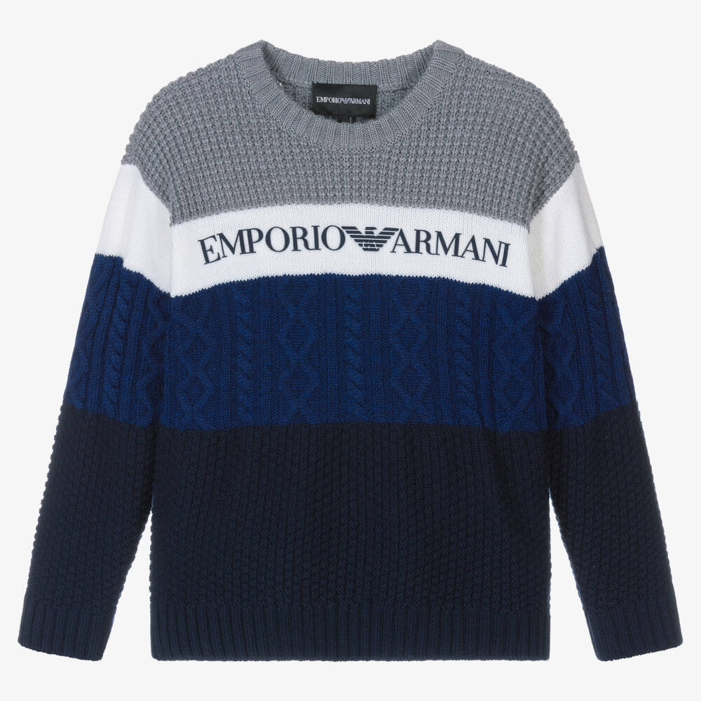 A cosy sweater for boys from Italian brand Emporio Armani, with grey, ivory and blue panels. Knitted in various patterns for an interesting texture, it is made in a luxuriously soft wool mix, with an Emporio Armani rubberised logo across the front.