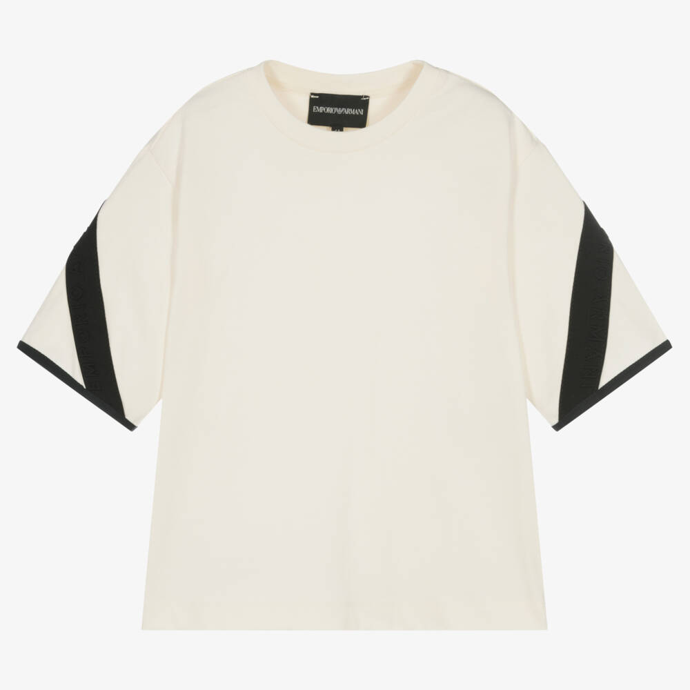 Ivory T-shirt for boys by Italian designer Emporio Armani, made from soft cotton jersey. In a cool relaxed fit, this top has black logo embroidered trims that decorate the sleeves for a designer finish.
