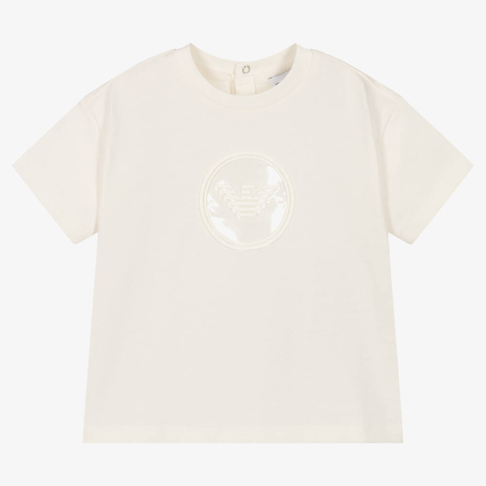 Ivory cotton T-shirt for little boys from Emporio Armani, with the Italian designer's Eagle logo displayed on a transparent and rubberised patch on the front. Made in soft jersey, it fastens with poppers on the back.