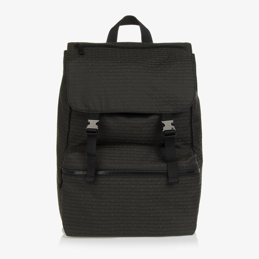 Dark khaki green backpack for boys from Emporio Armani, made in silky smooth fabric with a distinctive logo pattern. Combining practicality with stylish design, this roomy bag has a spacious main compartment with a secure drawstring closure. Inside are handy slip pockets and a small mesh pocket for organising essentials. There are extra zip pockets on the front for even more storage space. The lightly padded mesh back is gently reinforced and the adjustable shoulder straps are woven with Emporio Armani logos. The flapover top is fastened with adjustable buckle clip straps, adding a touch of gunmetal hardware.