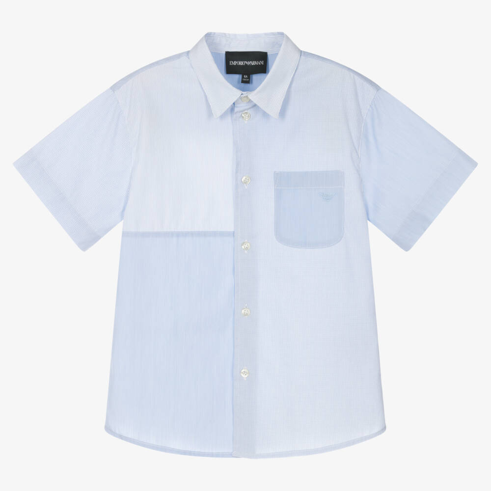 Super cool pale blue shirt for boys by Emporio Armani, made from lightweight cotton poplin. This short sleeve laid-back style has a patchwork style with striped and checked panels. There are subtle designer touches with the branded button fastenings and Eagle logo embroidery on the front pocket.