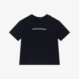 A navy blue T-shirt for younger boys by Italian label Emporio Armani, made in soft cotton jersey. With a cool varsity-inspired look, this short-sleeved tee has a distinctive, beige, branded crest appliqué on the front. There is ivory velvet piping across the chest and ivory tipping on the ribbed cuffs. To make dressing easier, there are logo-embossed poppers on the back.