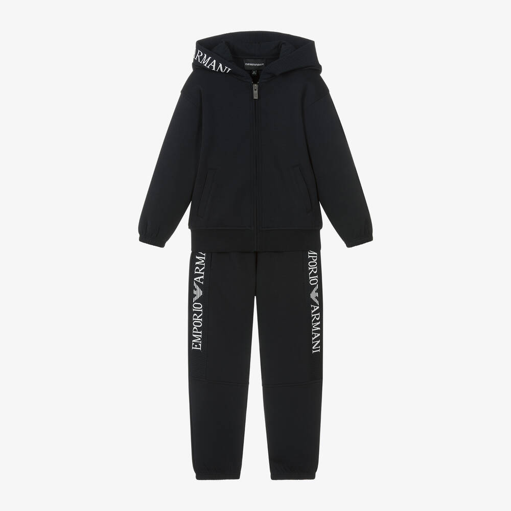 Navy blue tracksuit for boys by Italian brand Emporio Armani, made in a beautifully soft and smooth cotton blend jersey. The zip-up hoodie has useful front pockets and elasticated cuffs. The ribbed trim around the hood features a white intarsia logo for a stylish, but sporty look. The joggers have matching knitted trims with white logos on the side of each leg. There are neat, on-seam front pockets and an elasticated waistband for a comfortable fit.