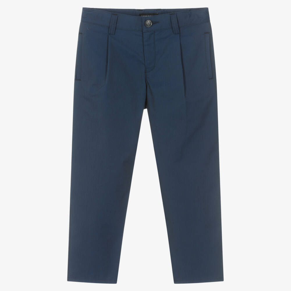 Smart-casual navy blue trousers for boys by Emporio Armani, made in lightweight cotton twill. They have a tailored design, with a slightly tapered leg and pleats on the front. Fastening with a zip and button, you can ensure a comfortable fit with the adjustable waist. There are three jetted pockets and a silver Eagle logo badge on the back for a subtle branded finish.