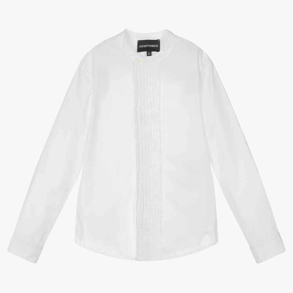 Ideal for those special occasions, this off-white cotton shirt for boys is by Emporio Armani. Made in lightweight poplin, this ceremony piece has a collarless design and smart pintucks down the front. There is a small Eagle logo embroidered just above the hem, for an understated yet recognisable designer touch.