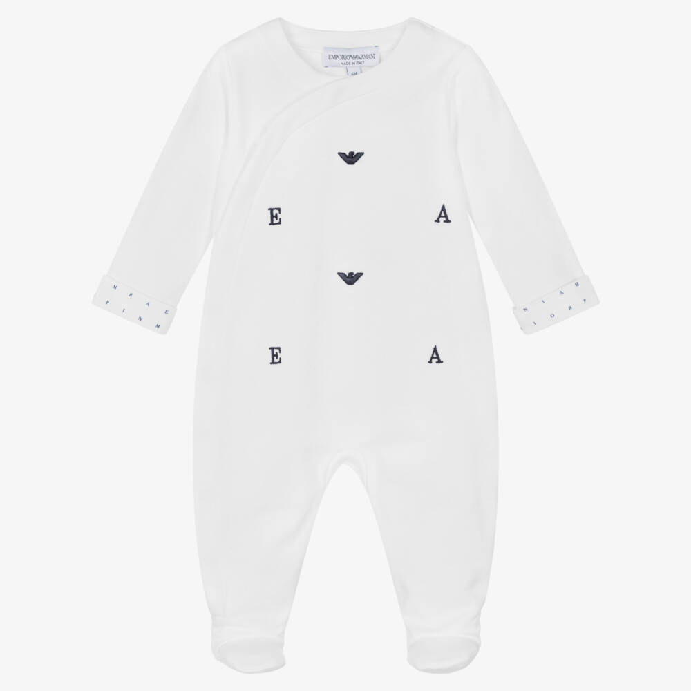 A white babygrow for boys by luxury Italian designer Emporio Armani, made in the softest cotton jersey with a looped underside. Instantly eye-catching, it has the brand's iconic Eagle logo with 'E' and 'A' embroidered on the front, with branded turn-over cuffs. There are useful popper fastenings on the front, and a delicate elasticated back. This item is made from organic fibres, with less chemicals and energy used.